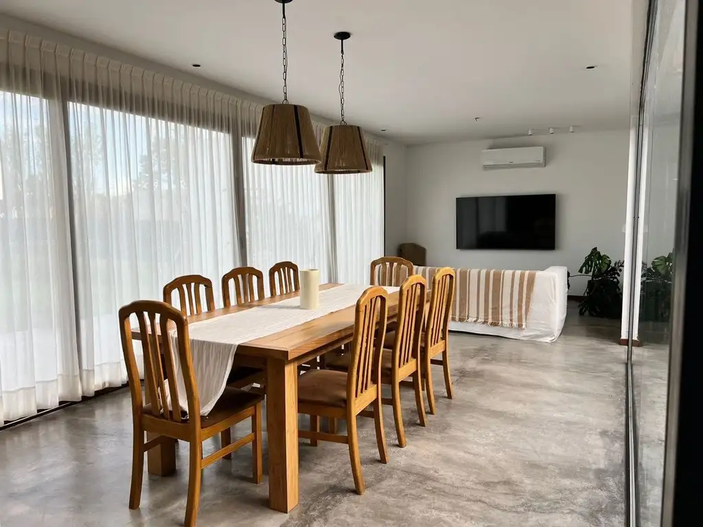 El sector social se abre hacia el jardín, integrando cocina, comedor y estar en un ambiente amplio, luminoso y funcional. Los materiales —pisos de cemento alisado y carpinterías de alta prestación en PVC simil madera con DVH— aportan calidez, eficiencia y coherencia estética. Todos los ambientes cuentan con losa radiante.