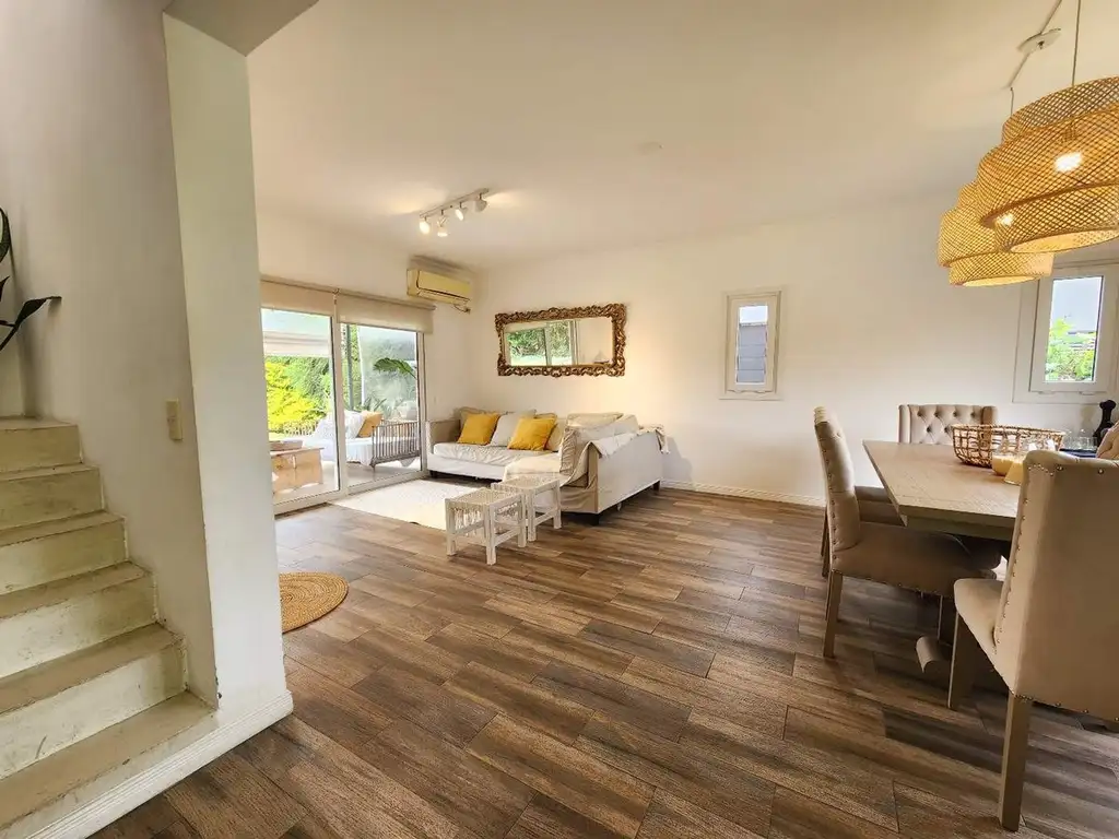 Living-comedor con ventanales que conectan con la galería y el jardín, generando un espacio cálido y armonioso.