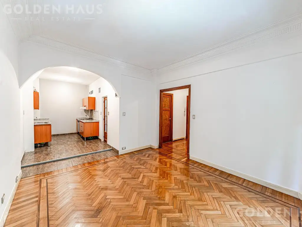 Piso de parqué en todos los cuartos, de madera de roble en el living/comedor y pasillo y de pinotea en los dormitorios. El living luce una cenefa original de peculiar elegancia.