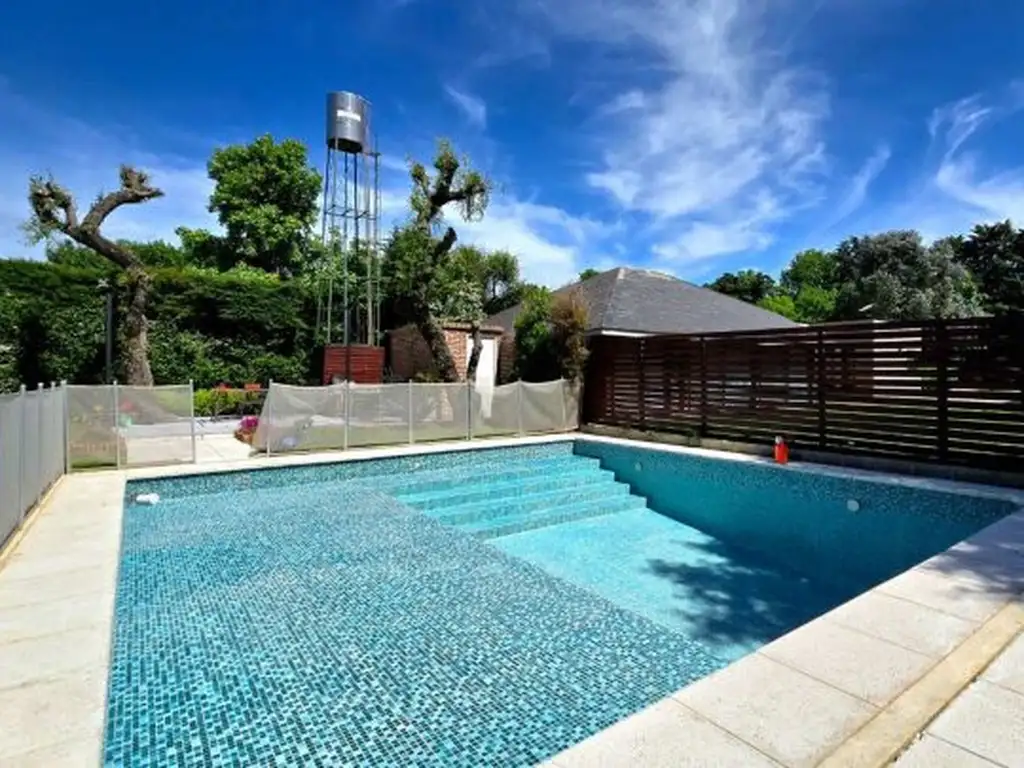 El parque, con grama bahiana, riego automático e iluminación perimetral, se complementa con una pileta automatizada con luces y preparada para climatizarse.