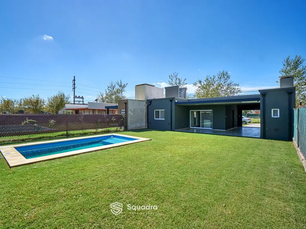 Galería con parrillero y piscina. Baño exterior. Cuarto de guardado. Cochera para dos autos con portón de aluminio tipo persiana automatizado.