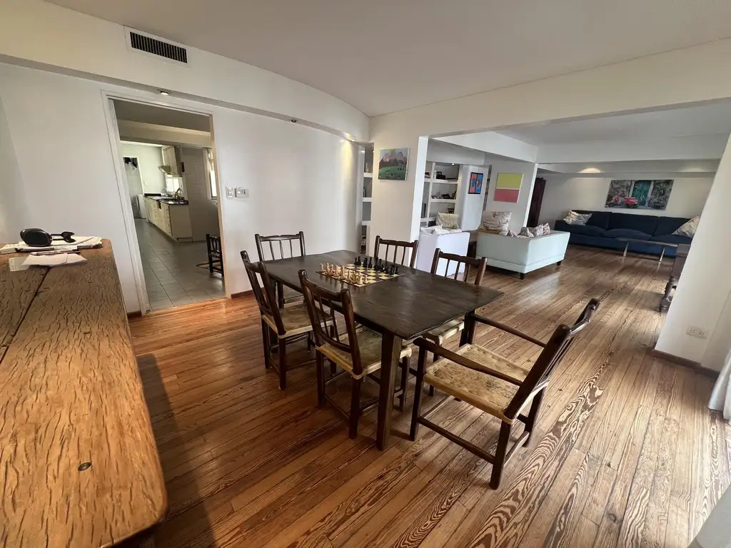 Imponente recepción, amplio Living de 7.80 x 6.00 + Comedor de 5.20 x 4.00 + family, todo con pisos de madera, persianas barrio y salida a balcón corrido al frente, muy luminoso.