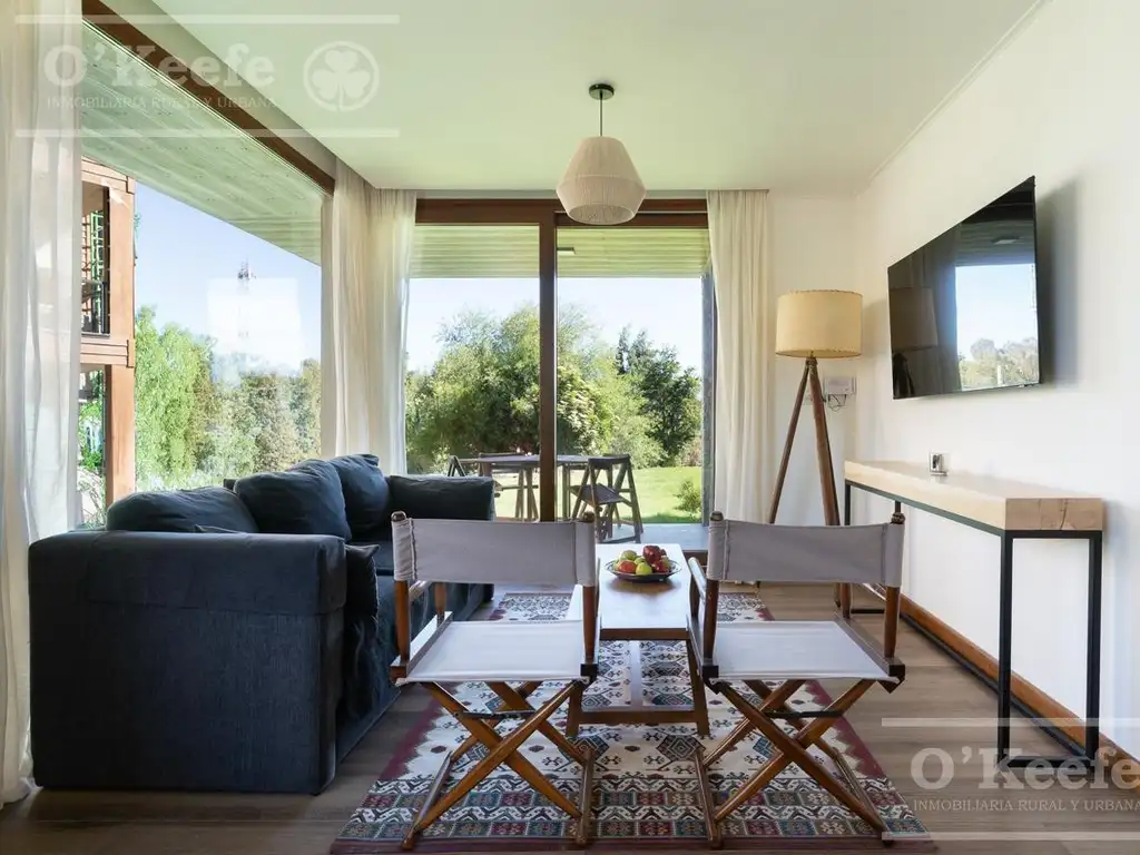 Living comedor con cocina integrada y salida al jardín, con terraza y parilla. Dos dormitorios, uno en suite. Dos baños completos y cochera descubierta.