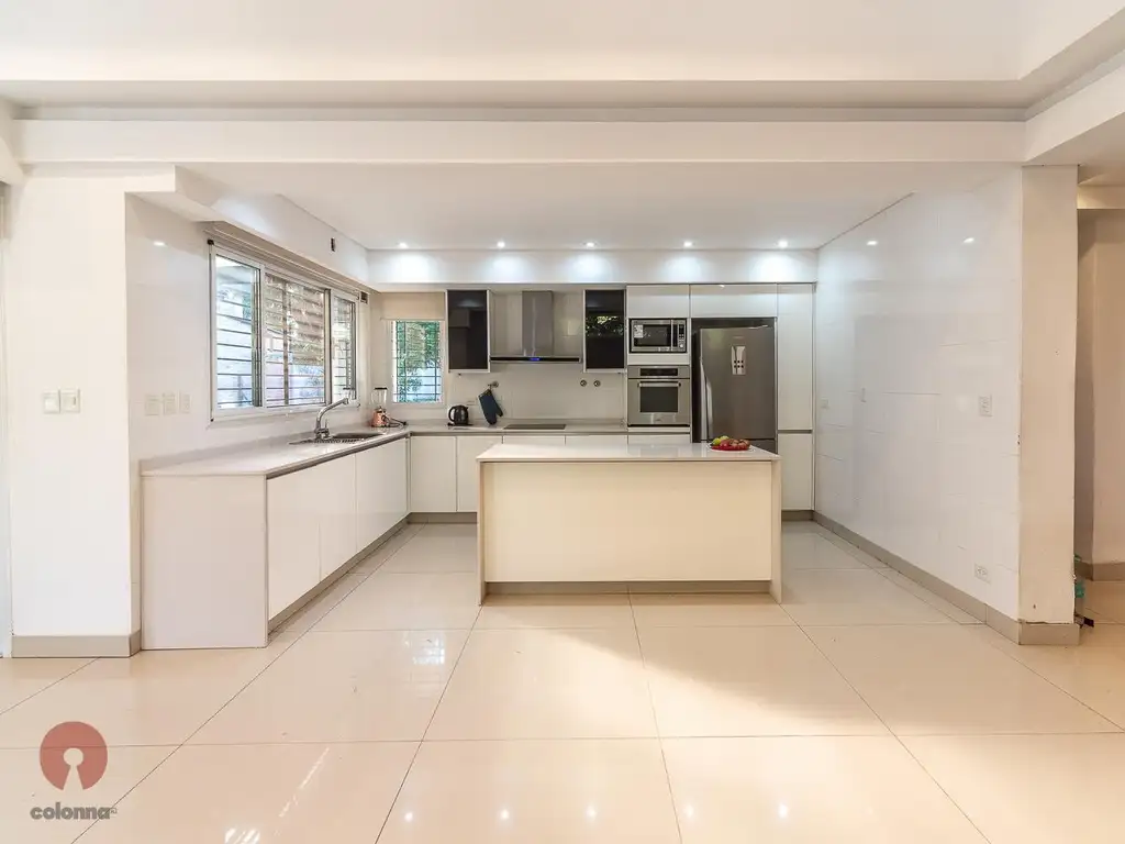 El área social se desarrolla en un ambiente amplio de concepto abierto que integra cocina, living y comedor. La cocina presenta un diseño moderno, equipada con muebles laqueados en blanco y mesada de Silestone, con alacenas y campana de acero inoxidable que aportan una estética limpia y sofisticada. Una isla central con mesada de Silestone y diseño personalizado organiza el ambiente, funcionando tanto como elemento de separación como sector para comidas informales. Desde allí se destaca un gran ventanal que brinda excelente luminosidad natural y visuales abiertas hacia el área de parrilla. Cerramientos y puertas de primera calidad, tiene toda la instalación para losa radiante.