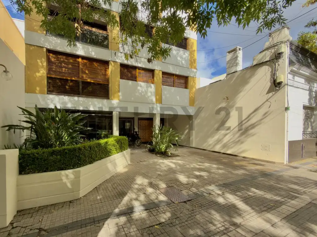Al ingresar, el edificio ofrece una cálida sala de estar vidriada, amplia y luminosa, pensada para una recepción confortable, con baño de servicio.
