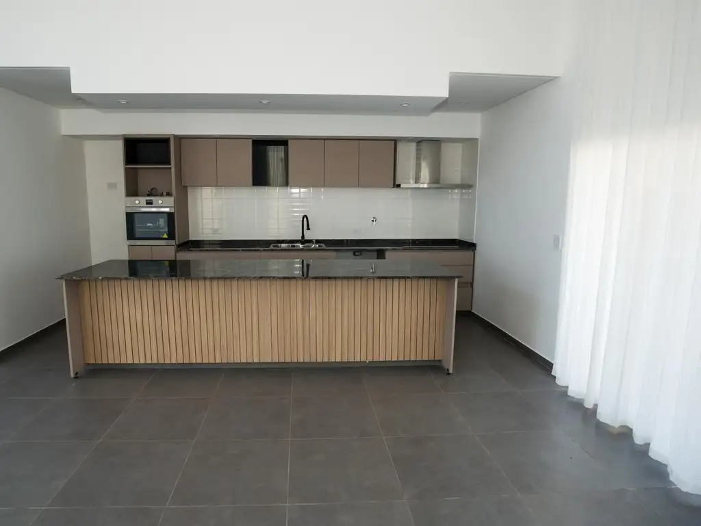 La cocina esta equipada con isla central con mesada de granito y bajo mesada, además de mesada adicional, muebles bajo mesada, horno y anafe eléctrico. Así mismo, cuenta con la instacion de gas efectuada.