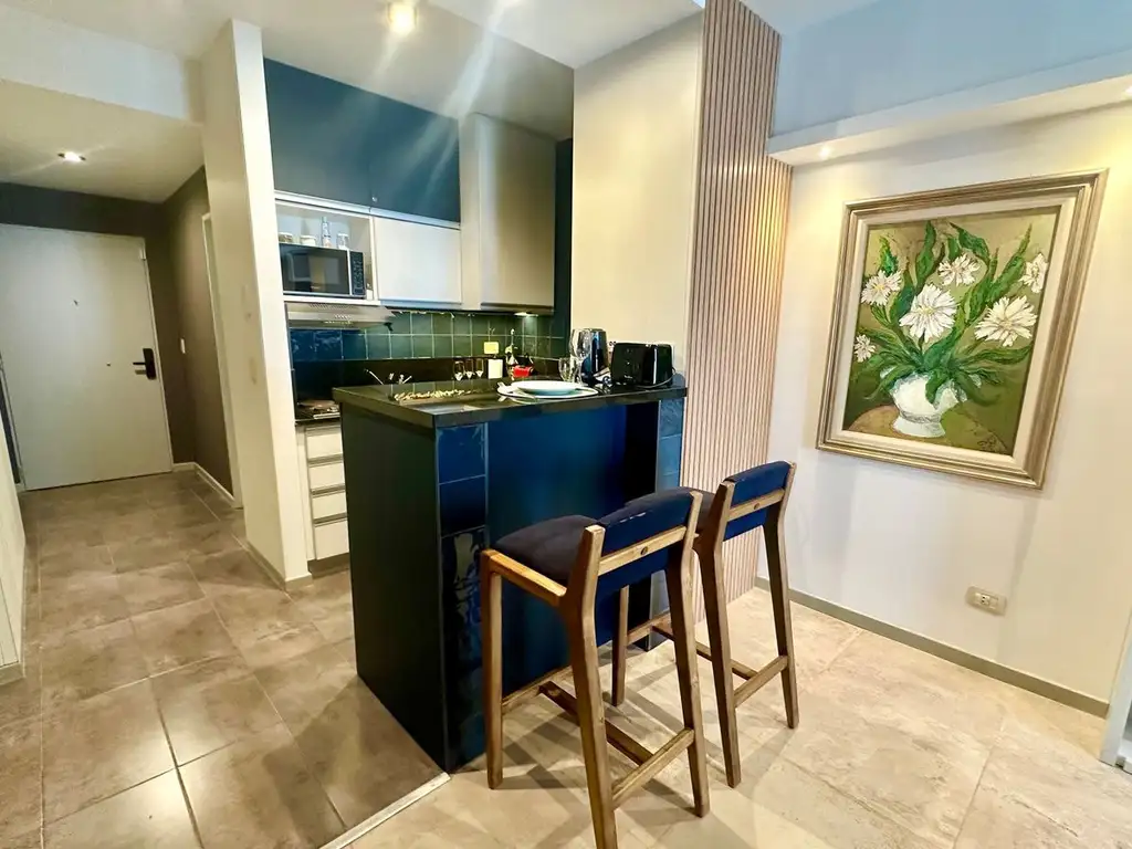 Muy luminoso con desayunador y cocina integrada, balcón semicubierto.