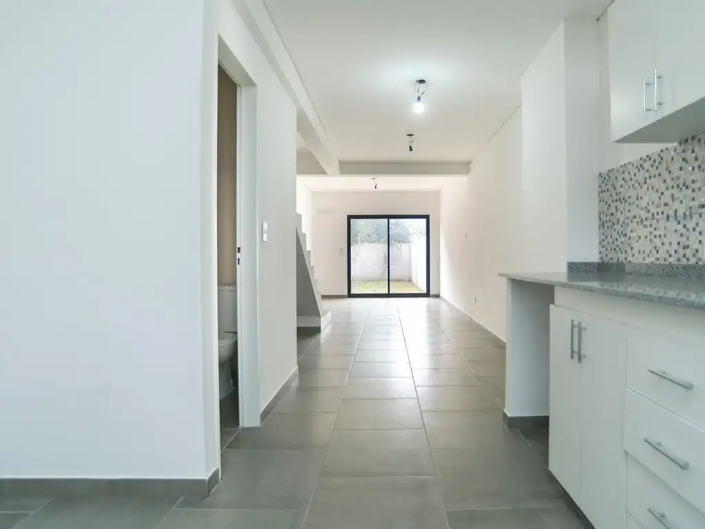 En planta baja, cochera abierta, cocina, living/comedor, toilette y patio con cerco de 2M de altura.