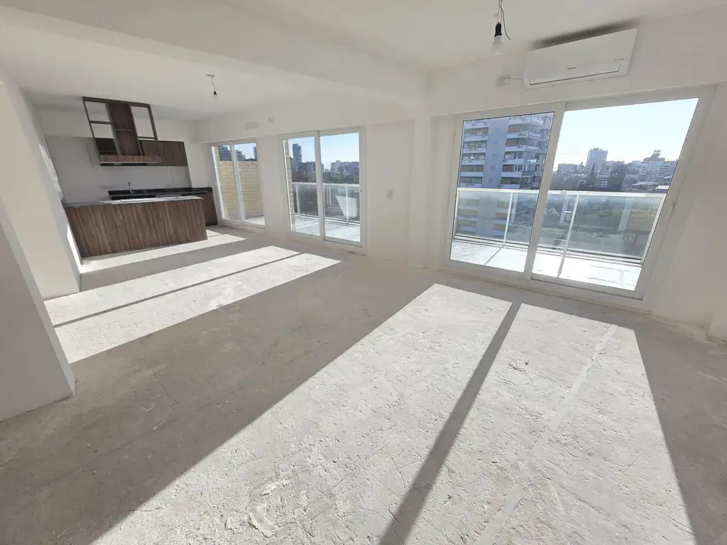 Living comedor enorme en L con salida a balcón aterrazado al frente totalmente abierto.