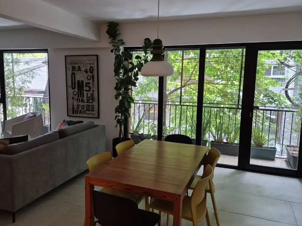 El área social se compone de un luminoso living-comedor con grandes ventanales que permiten una conexión visual directa con el entorno arbolado y salida a un balcón corrido al frente, ideal para disfrutar del aire libre y la luz natural durante todo el día.