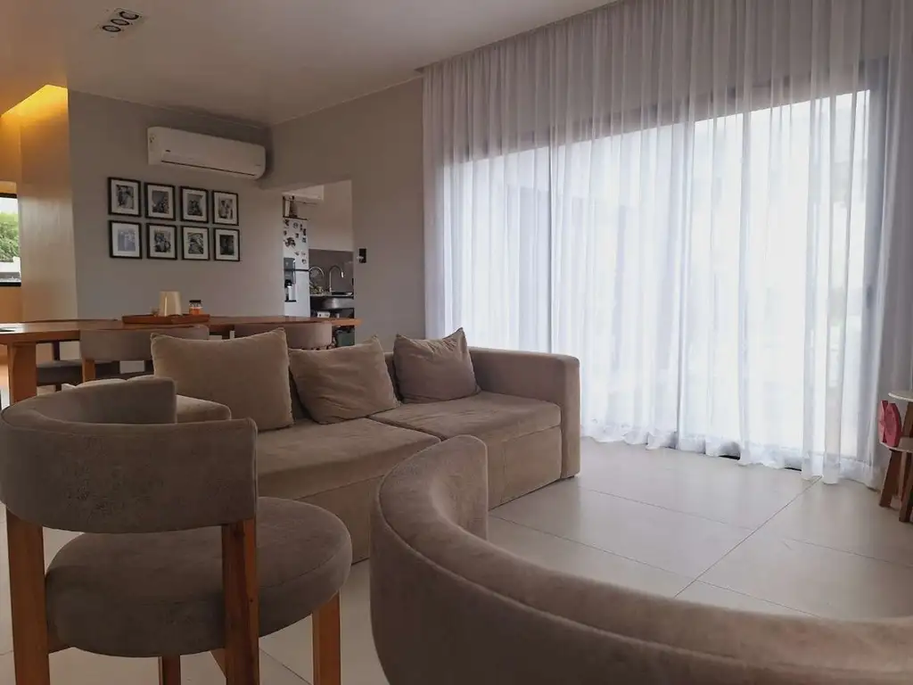 El living comedor integrado proporciona un ambiente espacioso y funcional, conectado directamente con la cocina moderna. Una galería techada con asador amplía los espacios de reunión y entretenimiento. La pileta de 7x3,5 metros se constituye como punto focal del patio, ofreciendo un entorno ideal para momentos de recreación.