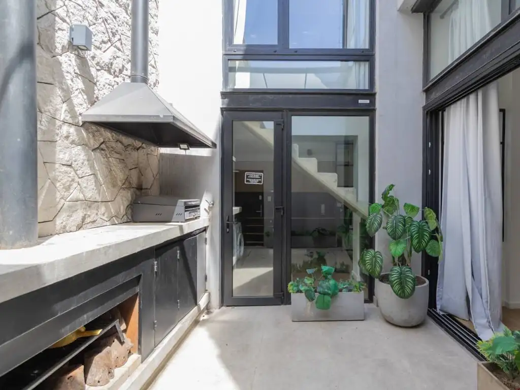 Acceso en planta baja por patio con parrilla y chimenea al aire libre. Cocina, toilette, comedor y living.