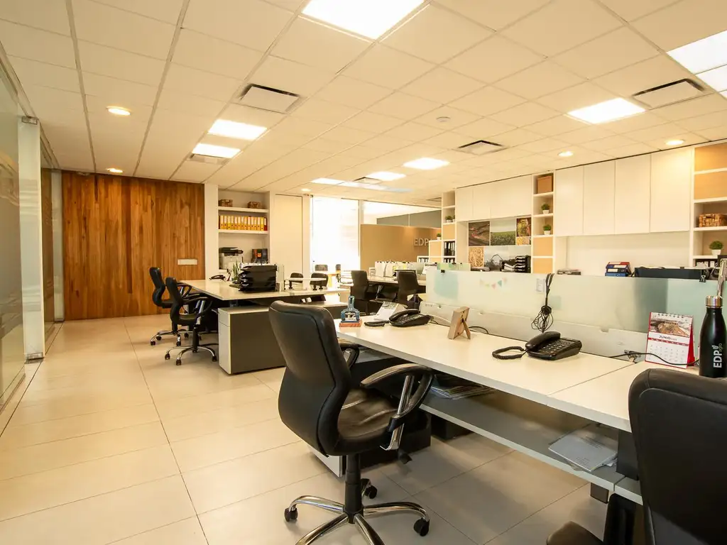 La planta cuenta con un muy lindo hall de entrada privada. Desde allí se accede a un espacio común muy amplio para varios puestos de trabajo desde donde se ingresa a 1 gran sala de reuniones, a 2 despachos privados las 3 salas con grandes ventanales y muy linda vista. A su vez cuenta con una amplia cocina con comedor diario y 2 baños completos.