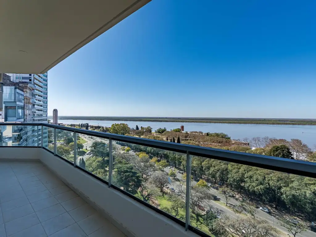 Descripción: Al ingresar se accede al living-comedor que tiene salida al balcón principal con vista panorámica al río Paraná. La cocina se encuentra sectorizada mediante barra desayunadora. El dormitorio principal funciona como suite, incluye baño en suite y salida a un segundo balcón privado. La unidad dispone de ventilación cruzada y calefacción por radiadores. El edificio ofrece cochera, pileta, solárium y quincho con parrillero.
