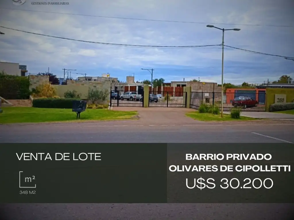 "CARINA DROZD gestiones inmobiliarias VENDE": EXCELENTE LOTE en Barrio PRIVADO "OLIVARES DE CIPOLLETTI", en Luján de Cuyo: Calle Cipolletti 280, a pocos metros de la rotonda de la Virgen y del centro comercial "Terra Malva". Ingreso al Barrio con Portones Automatizados, y Cámaras de Seguridad en todo el barrio. Cierre perimetral de material, electrificado, en todo el perímetro. Con 26 lotes, la mayoría ya construidos o en proceso. Excelentes VISTAS Montañas. El barrio es tranquilo, con muy buena urbanización. SUPERFICIE del lote: 348 m2 - Frente y Fondo: 12,54 m- Lateral Este: 28 m- Lateral Oeste: 27 m- SIMETRICO- ORIENTACION: Norte. SERVICIOS SUBTERRANEOS: luz, aguas, cloacas y gas natural. Calle Asfaltada. VALOR: U$S 30.200- ESCRITURACION INMEDIATA. FINANCIACION Propia a conversar, abonando un 75% de contado. Expensas: $ 25.000 aprox.