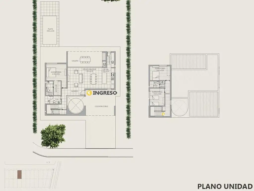 Vivienda desarrollada en dos plantas, con ingreso a estar comedor integrado y cocina con mobiliario completo. En planta baja se dispone toilette y salida a galería semicubierta con expansión al jardín y la pileta. Suite principal con vestidor en planta baja. En planta alta se ubican dos dormitorios asistidos por baño completo. Cochera doble en planta baja.