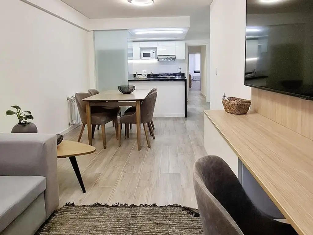 La unidad incluye aberturas de aluminio con DVH, pisos de porcelanato, cocina completamente amoblada con alacenas, bajo mesadas, cocina a gas, caldera individual y purificador. También posee calefacción por radiadores, interiores de placard terminados, y en el balcón se encuentra una práctica mesada con grill eléctrico para disfrutar de asados sin salir de casa.