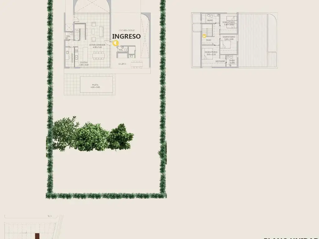 Vivienda desarrollada en dos plantas, con ingreso a estar comedor integrado y cocina con mobiliario completo. En planta baja se dispone toilette y salida a galería semicubierta con expansión al jardín y la pileta. Suite principal con vestidor en planta baja. En planta alta se ubican dos dormitorios asistidos por baño completo. Cochera doble en planta baja.