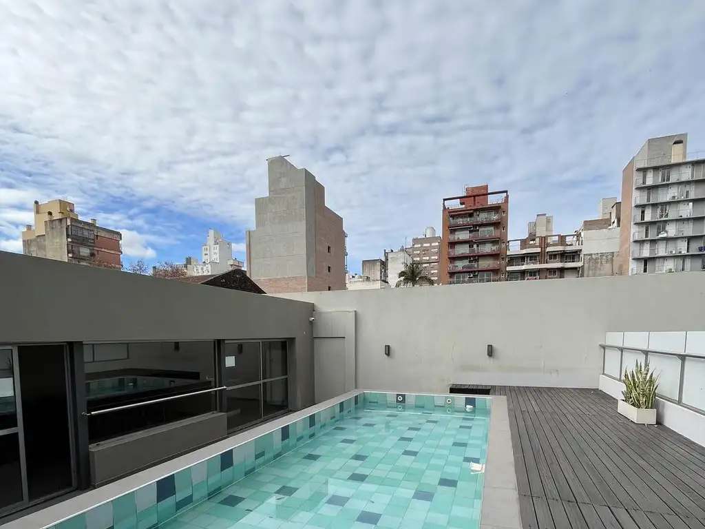 Monoambiente en alquiler, moderno, balcón, patio, quincho, parrillero, pileta.