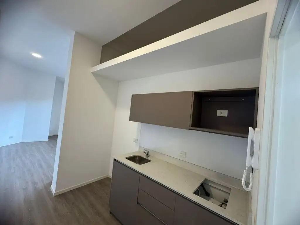 - Sector de cocina con mesada con mueble bajo mesada, alacena, anafe eléctrico y bacha de lavado