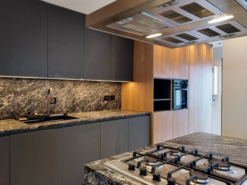 7. Muebles de cocina y lavadero en melamina, mesada, alzada y desayunador en piedra granito boreal en terminación Leather.