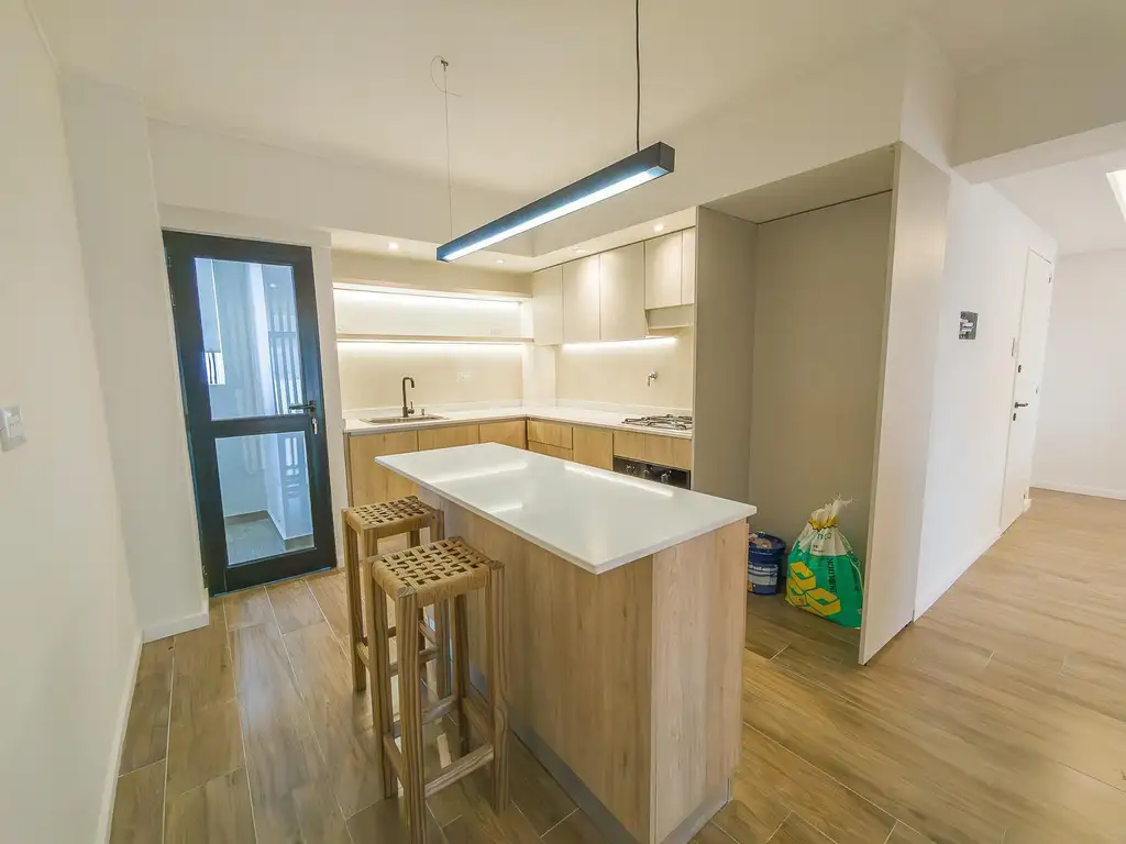 El departamento cuenta con 2 baños completos y un toilette de recepción, diseñados con loza sanitaria y griferías de primeras marcas. El amplio estar comedor, junto con una cocina semi-integrada que incluye isla, alacenas y bajo mesadas, crea un ambiente ideal para la vida familiar. La cocina está equipada con horno eléctrico, anafe a gas, y espacio técnico para heladera.