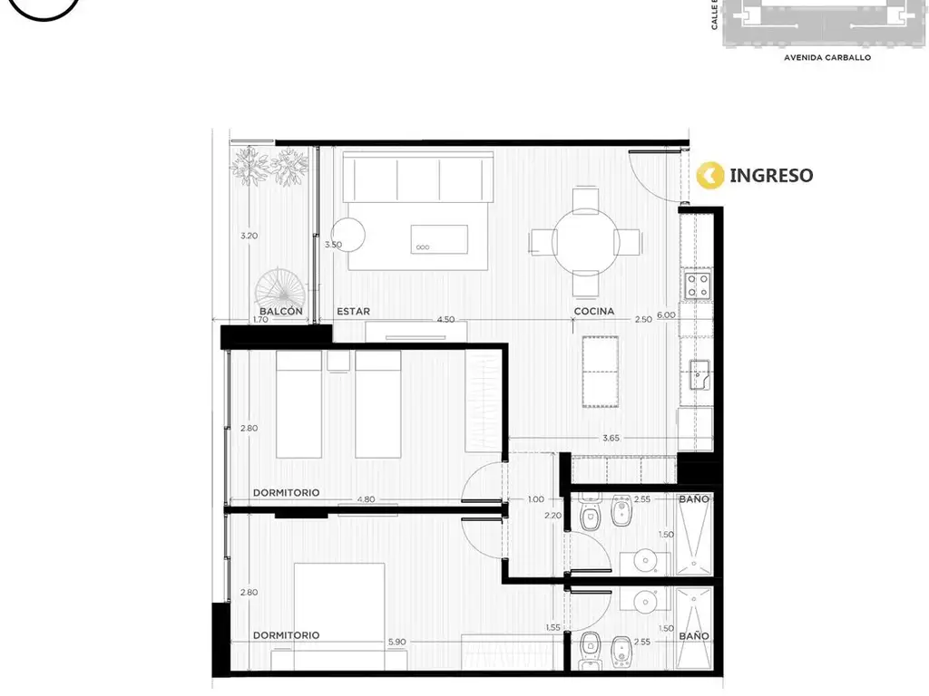 Estar/comedor principal, cocina independiente, lavadero, dos dormitorios, uno de ellos en suite con vestidor y baño privado, baño completo adicional y espacio de escritorio. Balcón terraza como expansión exterior.