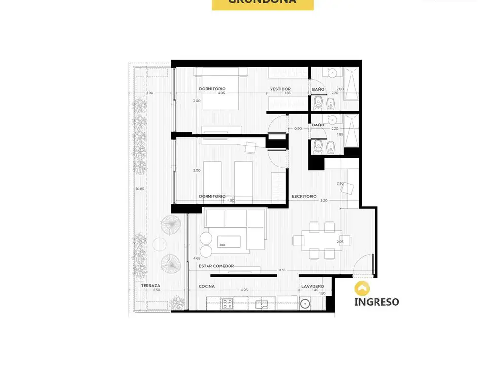 Estar/comedor principal, cocina independiente, lavadero, dos dormitorios, uno de ellos en suite con vestidor y baño privado, baño completo adicional y espacio de escritorio. Balcón terraza como expansión exterior.