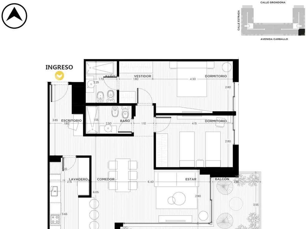 Estar/comedor principal, cocina independiente, lavadero, dos dormitorios, uno de ellos en suite con vestidor y baño privado, baño completo adicional y espacio de escritorio. Balcón terraza como expansión exterior.