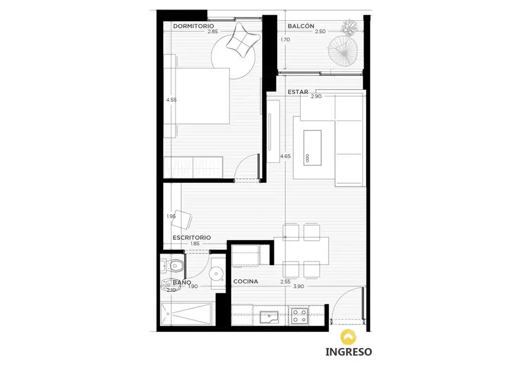 Estar, cocina/comedor integrada, dormitorio independiente, baño completo y espacio previsto para escritorio. Balcón orientado al Norte sobre calle Grondona. Distribución funcional con circulación eficiente entre área social y privada.