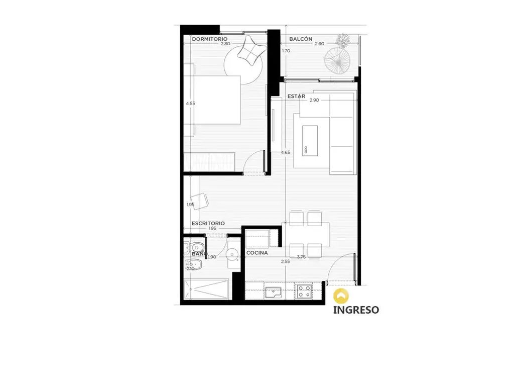 Estar, cocina/comedor integrada, dormitorio independiente, baño completo y espacio previsto para escritorio. Balcón orientado al Norte sobre calle Grondona. Distribución funcional con circulación eficiente entre área social y privada.