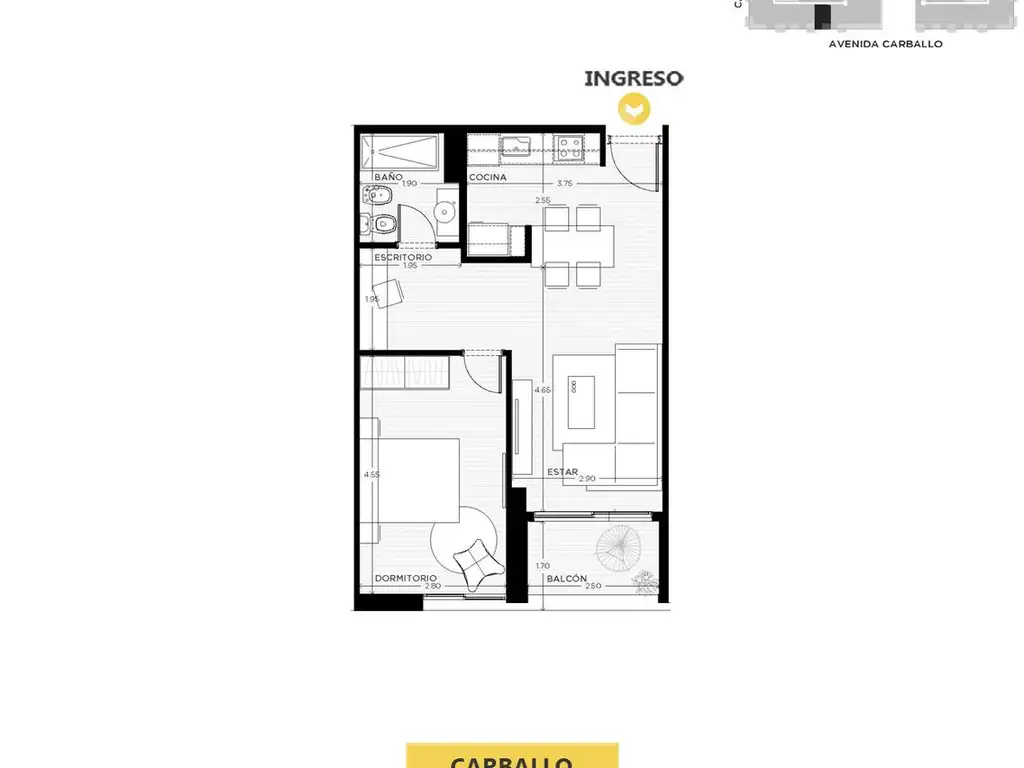 Ambiente único de generosas dimensiones con posibilidad de sectorizar dormitorio. Baño completo. Balcón terraza con expansión exterior y ventilación natural.