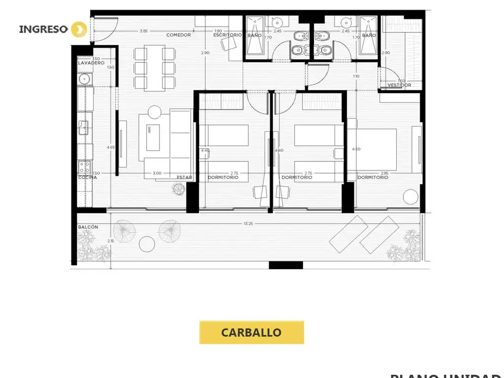 Estar/comedor principal de gran desarrollo, cocina independiente, lavadero, tres dormitorios, principal en suite con vestidor y baño privado, baño completo adicional y espacio de escritorio. Balcón terraza de importante dimensión como expansión exterior.