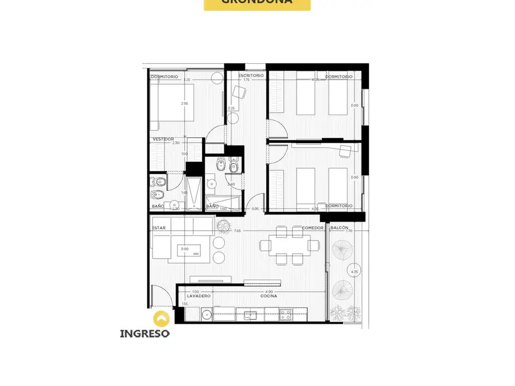 Estar/comedor principal de gran desarrollo, cocina independiente, lavadero, tres dormitorios, principal en suite con vestidor y baño privado, baño completo adicional y espacio de escritorio. Balcón terraza de importante dimensión como expansión exterior.