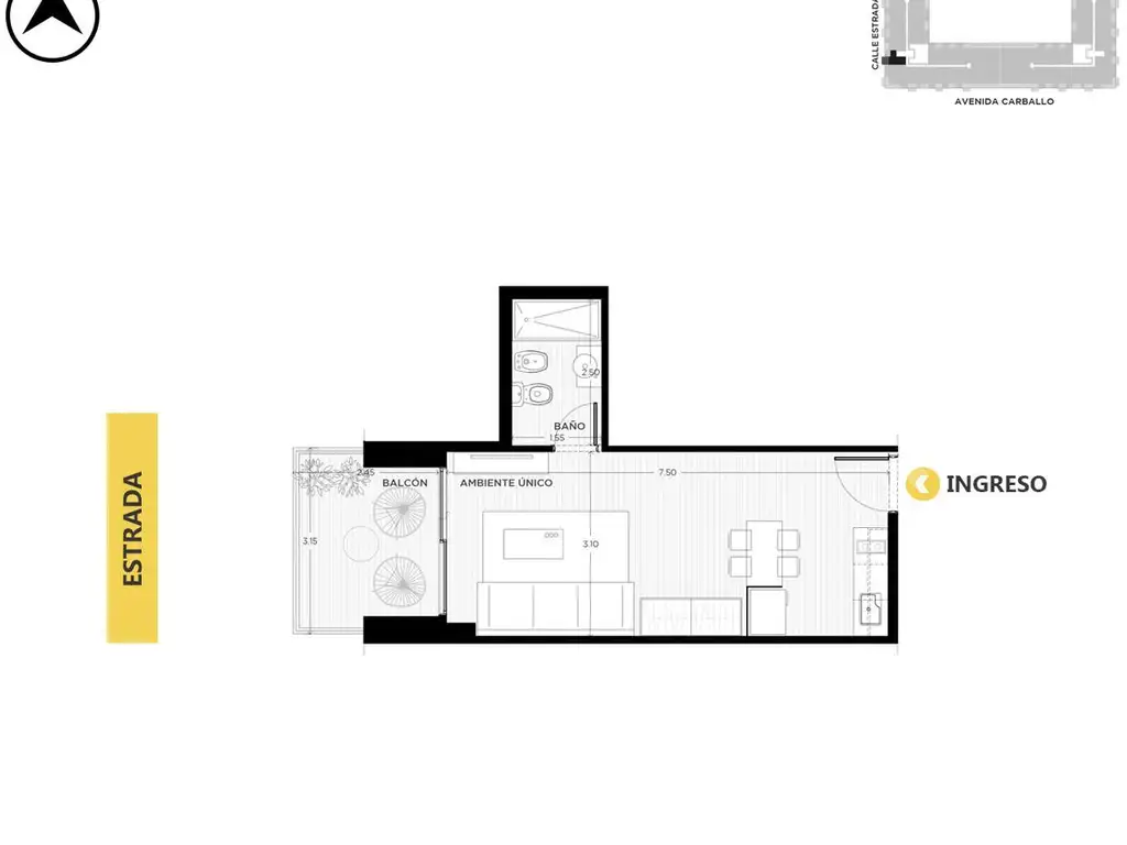 Ambiente único de generosas dimensiones con posibilidad de sectorizar dormitorio. Baño completo. Balcón terraza con expansión exterior y ventilación natural.