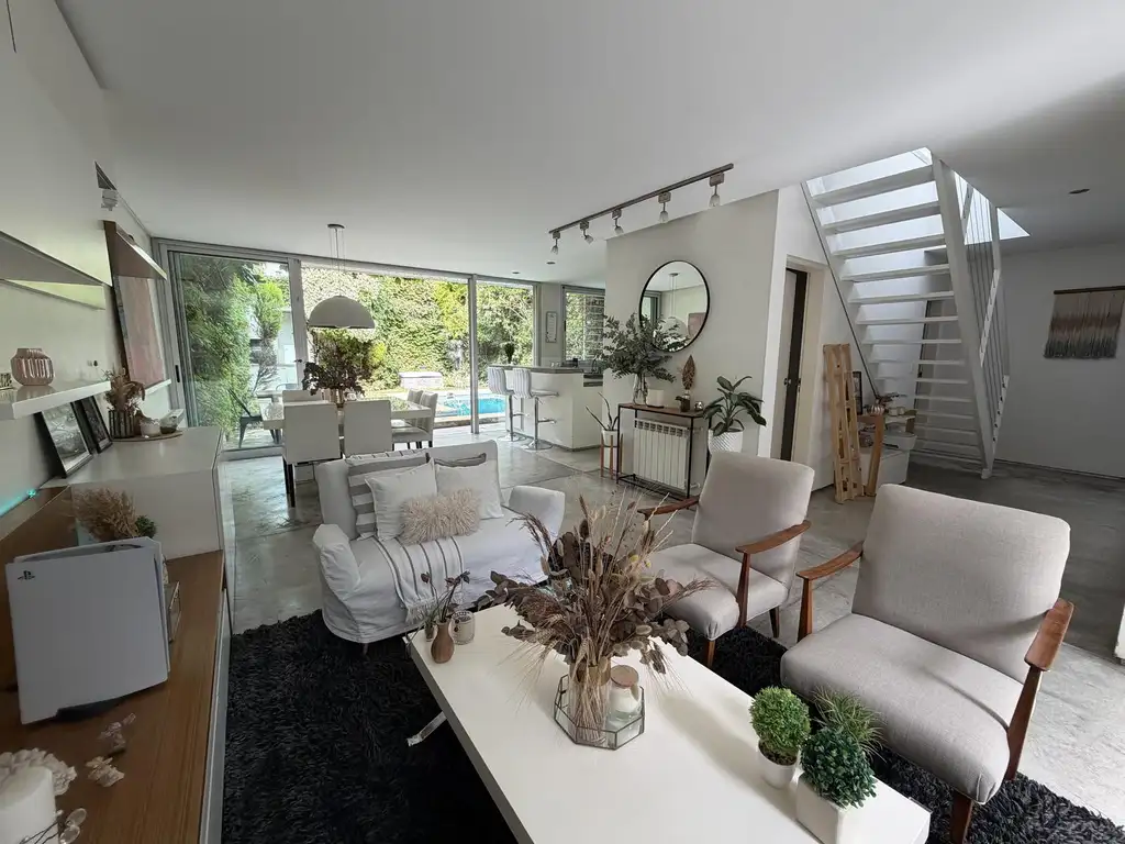 En la planta baja, encontrará dos amplias habitaciones, una de ellas en suite con baño privado y vestidor. El espacio principal tipo loft integra armoniosamente el living, comedor y cocina americana con barra, brindando una vista inigualable al jardín privado que incluye una piscina y parrilla. La planta también cuenta con un patio delantero, un baño completo y un toilette.