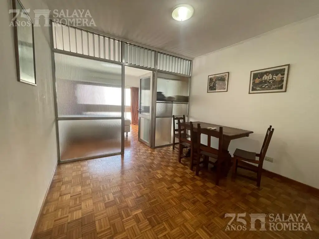 El departamento, con una antiguedad de 50 años, se encuentra en el noveno piso de un edificio de diez niveles, que cuenta con tres ascensores, encargado y ayudante durante el día, y vigilancia las 24 horas. La unidad está inteligentemente dividida, proporcionando un sector de recepción que funciona como living, equipado con mesa y sillas. El área de descanso dispone de dos somiers de una plaza y mesas de luz. La cocina, independiente y a gas, está completamente equipada con muebles y heladera bajo mesada, complementada por un baño completo.