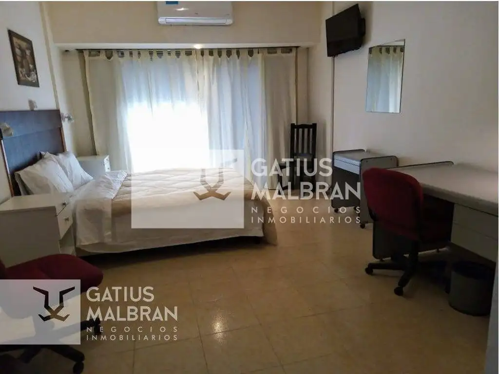 Tiene escritorio y placard. Cocina integrada equipada con heladera bajo mesada, microondas, pava electrica y anafe eléctrico.