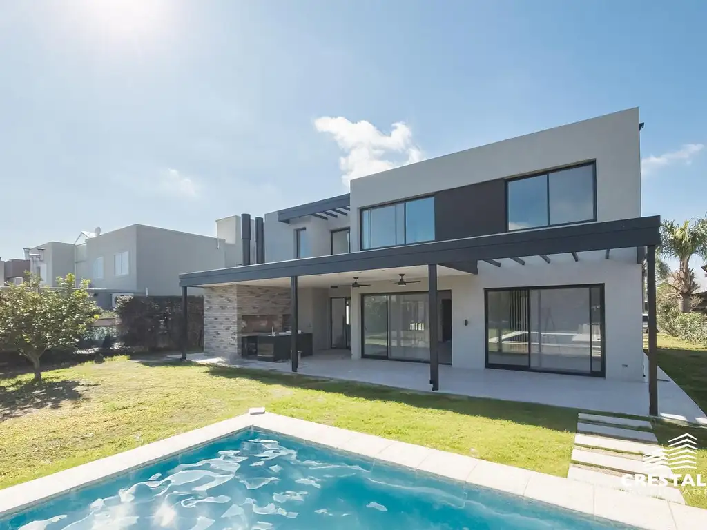 La vivienda es de estilo moderno/minimalista. El ingreso cuenta con una cochera muy amplia y semicubierta para alojar dos autos. Al ingresar, en el interior, posee un hall de ingreso acompañado de un toilette de recepción. Cuenta con una habitación en planta baja con vestidor. Seguido nos encontramos con el living comedor súper amplio y con increíble vistas a la galería. Cocina cómoda e independiente también con vistas al jardín. A continuación lavadero en planta baja. El living comedor, realizado con un concepto abierto y fluido, se conecta mediante amplios ventanales con la galería semicubierta que da hacia el jardín de la vivienda; la misma cuenta con un gran parrillero. Nos conecta con la planta alta una escalera donde nos encontramos con dos habitaciones asistidas por un baño, y luego con la habitación principal con vestidor y baño en suite. En el exterior, luego de la galería tenemos un increíble jardín y piscina.
