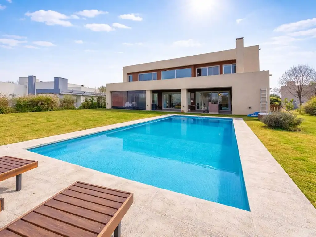 Gran terraza hacia el parque que acompaña la longitud de la casa, sistema de riego Hunter, 2 calderas independientes, aires acondicionados en todos los ambientes, losas radiantes con reguladores independientes de climatización por ambientes y aberturas de máxima calidad doble DVH de PVC alemanas.