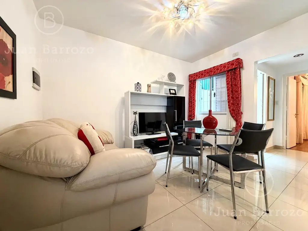 Living con piso de porcelanato, cocina con muebles sobre y bajo mesada, baño completo reciclado a nuevo.