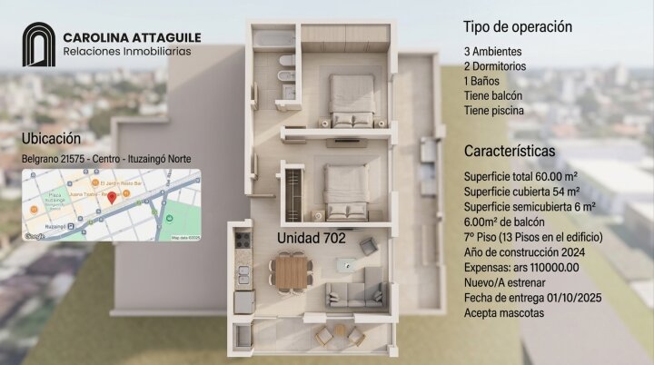 Expensas estimadas: $110.000 (ARS) . Balcón incluido . Apto mascotas . Pileta . 3 ambientes . Piso alto .