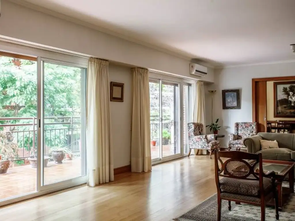 Hall de entrada. Living, comedor y escritorio al frente, con salida a balcón aterrazado. Toilette de recepción. Amplios pasillos y buena circulación interna.