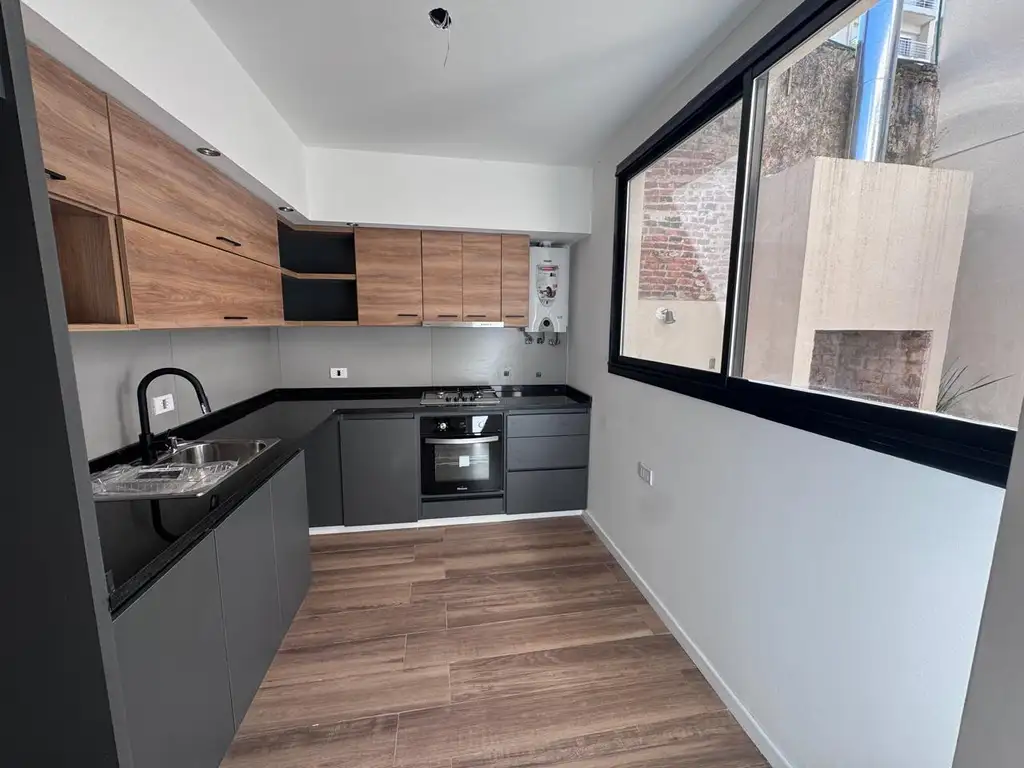 Dispone de cocina moderna en diseño con alacena y bajo mesada, mármol en granito negro, anafe con extractor de aire, horno empotrado y calefón a gas natural.