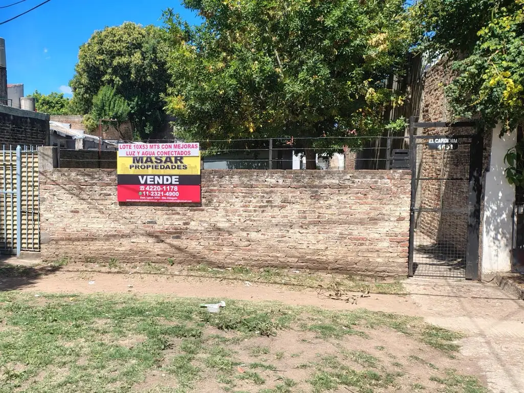 Regio lote muy bien ubicado a una cuadra de avda. Eva Peron (ex Pasco) y 150 mts de Avda. Dnto. Alvarez, con dos casillas prefabricadas con agua y luz conectadas (dos medidores de luz) y entrada de coches con porton corredizo, frente protegido con muro de ladrillo de 0,15 y alambre de púas, calle pavimentada muy buena zona ideal todo destino, varias líneas de transportes por Avda. Eva Perón, el lote tiene escritura e impuestos al día.