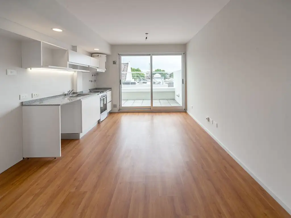 Dos ambientes divididos con placard, cocina a gas y termotanque eléctrico.