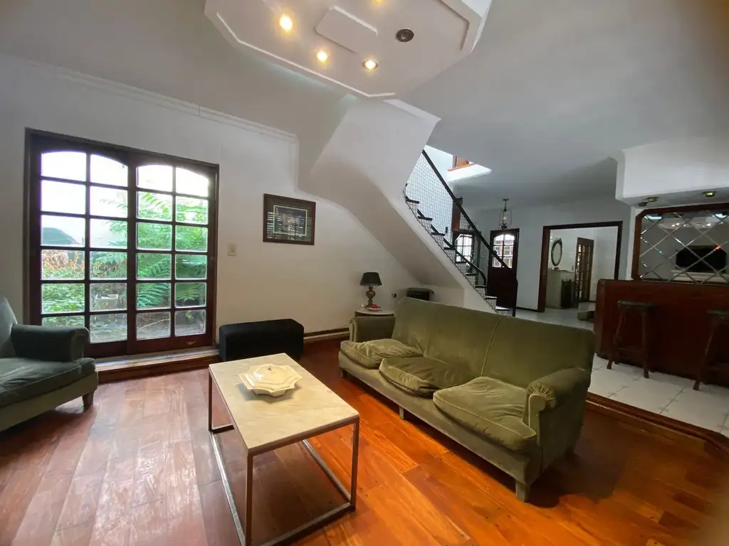 -Living comedor de generosas dimensiones, con segundo hogar a gas, bar integrado y pisos de madera tarugada. Este ambiente se vincula con un encantador patio interno con plantas, que aporta abundante luz natural a toda la planta.