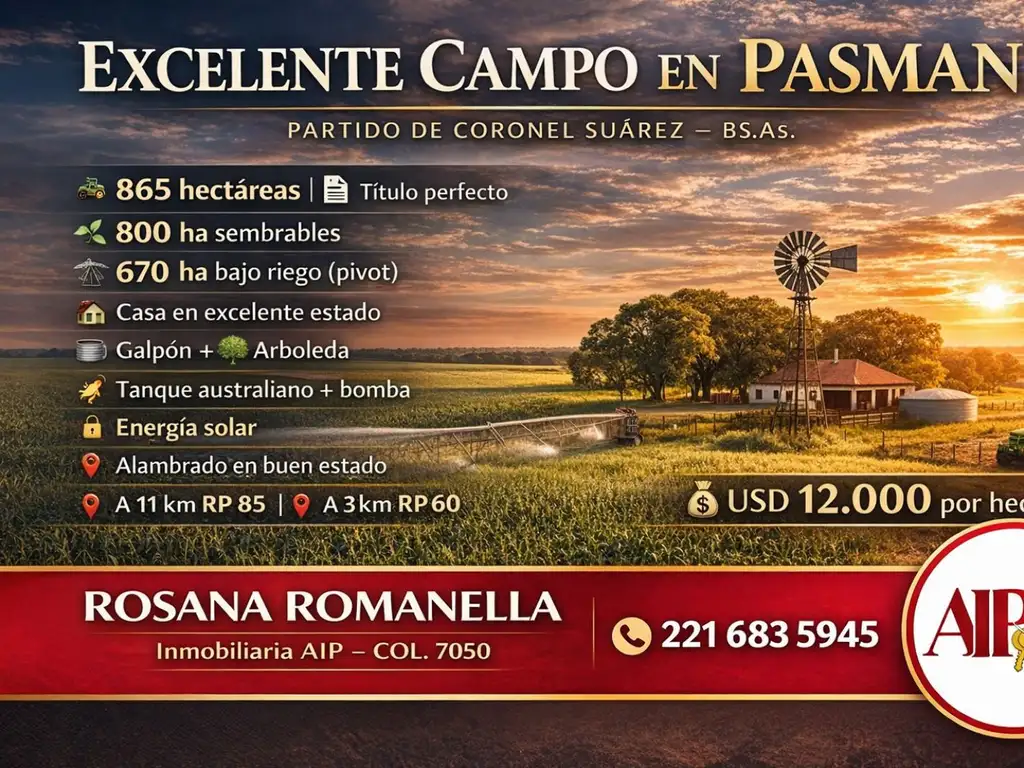 Un campo de gran potencial en Pasman, Coronel Suárez! Se ofrece un campo de 865 hectáreas, ubicado en una zona estratégica, con fácil acceso a las principales rutas provinciales y nacionales. La propiedad cuenta con título perfecto y está destinada a la actividad agrícola.