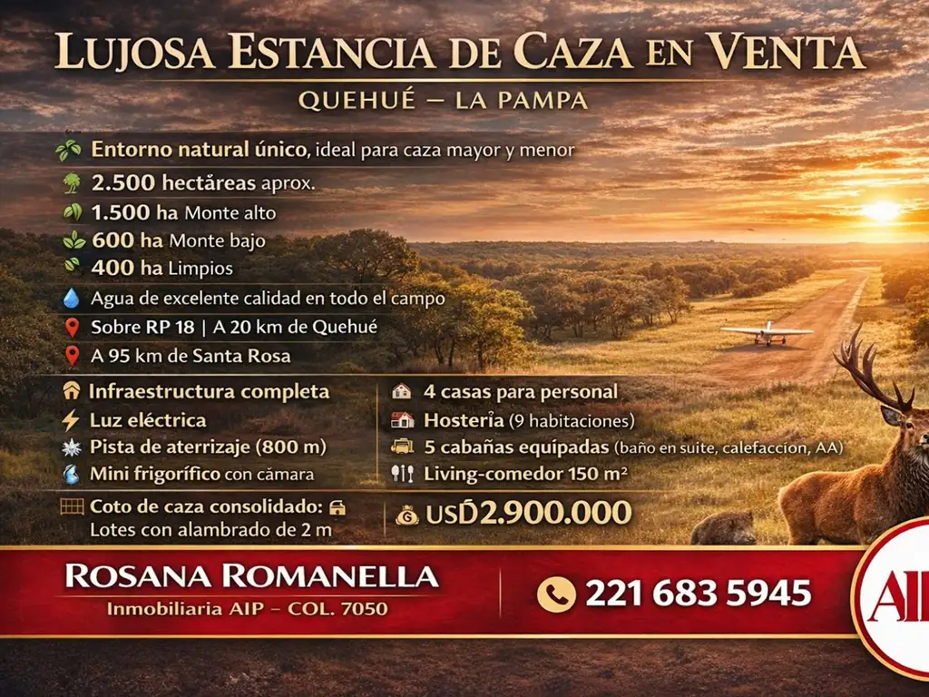 El campo cuenta con infraestructura para recibir visitantes y ofrecer una experiencia de caza única. El precio es de 2.900.000 dólares. A 20 km de la localidad de Quehue, sobre ruta 18. A 95 km de Santa Rosa