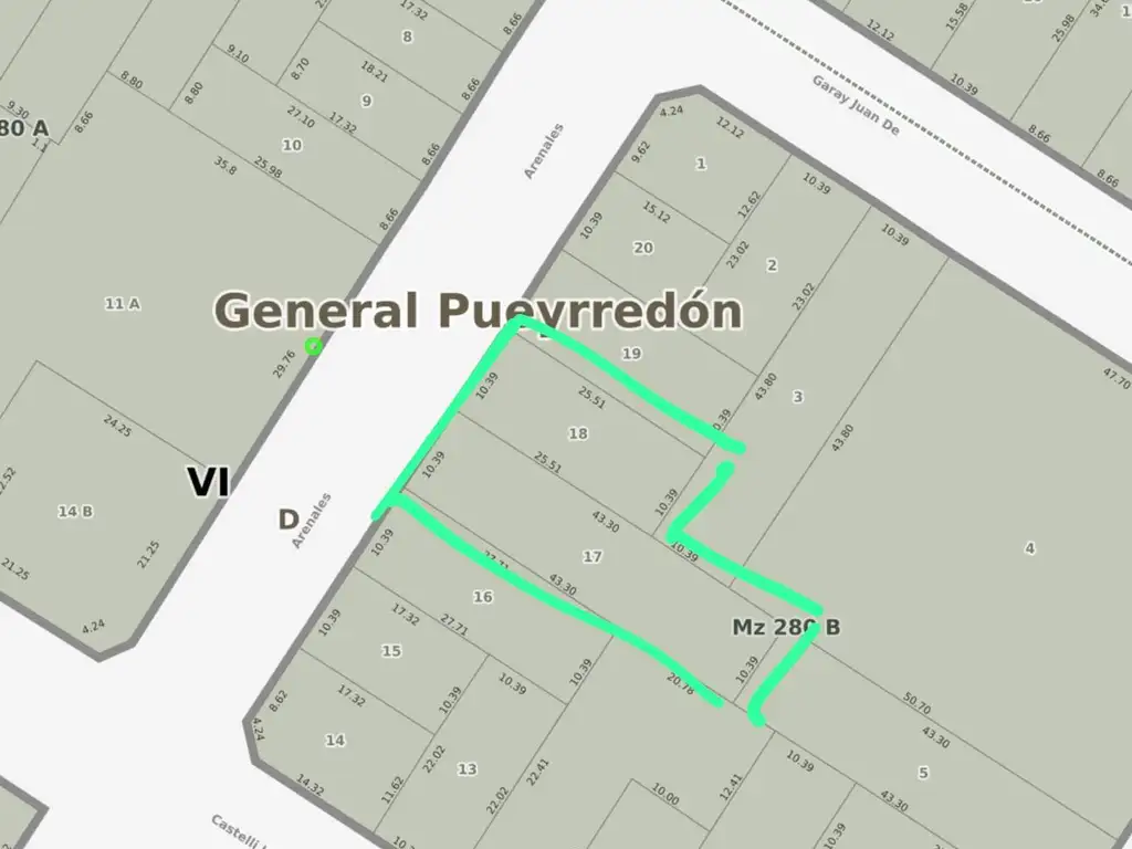 Dos lotes de 10,39m x 43,30m y 10,39m x 25,50m.